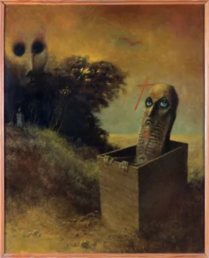 Początek lat 70. był szczególnym momentem w długoletniej karierze Zdzisława Beksińskiego. Po fascynacji sztuką abstrakcyjną oraz twórczych eksperymentach z rzeźbą i fotografią, artysta całkowicie poświęcił się nauce malarskiego rzemiosła. Godziny pracy spędzone przy sztalugach pozwoliły w końcu na „sfotografowanie“ nawiedzających go wizji w tzw. pejzażach metafizycznych. Cechą wspólną wczesnych dzieł była przede wszystkim obecność niepokojących desygnatów śmierci i ciemna, przygnębiająca kolorystyka. Słynną, „dreszczowcową“ serię doskonale reprezentuje oferowana w niniejszym katalogu kompozycja przedstawiająca bliską sennemu koszmarowi scenę. Biorący w niej udział bohaterowie i rekwizyty – szkaradna postać z piekła rodem, nadnaturalnej wielkości fantomowa twarz, nagrobki, znak krzyża – tworzą upiorny sztafaż w pozornie zwyczajnym krajobrazie. Drastyczne treści, jakie niosły ze sobą powstałe w latach 1971-1972 obrazy, spotkały się z żywym odzewem publiczności i odbiły się szerokim echem w ówczesnej prasie. Na łamach „Przeglądu Artystycznego“ recenzowano: Odrażająco zdegenerowane kształty, dwuznaczne pozy, bezradne gesty tych groźnych, lecz udręczonych przecież istot, pełzających lub kroczących wśród posępnych, dramatycznych pejzaży o niebie świecącym dalekim, zimnym blaskiem – budzą grozę i jednocześnie współczucie. Symbolika przedstawianych scen jest dość jednoznaczna, metafora mocna, surowa i brutalna. Przerysowana, karykaturalna wizja świata i człowieka może szokować – lecz to właśnie stanowi cel artysty (cyt. za: T. Sowińska, Zjawy i sfinksy, „Przegląd Artystyczny“, nr 3 (73), 1973, s. 14).
