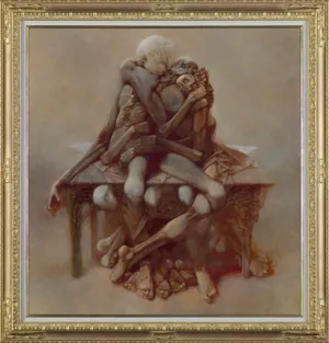 Zdzisław Beksiński, znany z przykładania wielkiej wagi do kwestii warsztatowych, zwykł kilkakrotnie opracowywać ten sam temat w wybranym ujęciu kolorystycznym. Jednym z najchętniej podejmowanych były – utrzymane w zgaszonej gamie brązów i szarości – konstrukcje antropomorficzne zbudowane z wyimaginowanego układu kostno - mechanicznego. Kompozycje te cechował efektowny dynamizm, uzyskany przez multiplikację figury ludzkiej, widoczny przede wszystkim w partii dłoni i stóp. Do grupy tych niezwykłych przedstawień należała prezentowana w niniejszym katalogu wersja tzw. krzesła kostnego, motywu znanego z kilku innych obrazów należących do kolekcji japońskiej (por. m.in. Bez tytułu, 1988, poz. 138 z aukcji 20 marca 2022). Siedząca na ławce humanoidalna kreatura wykonuje szereg czynności i gestów, które budzą skojarzenia z przemocą, kalectwem i rozkładem. Makabryczna estetyka, zatrważająca w pierwszym odczuciu, schodzi na dalszy plan w obliczu wirtuozerii obrazowania pseudoanatomicznych struktur wieloczłonowego organizmu. Zaskakująca „wiarygodność“ ukazanej anatomii – uważanej za wielki atut malarstwa Mistrza z Sanoka – intrygowała promotora jego twórczości, marszanda Piotra Dmochowskiego. W liście z października 1984 „Beks“ tłumaczył kolekcjonerowi: Anatomia na moich obrazach jest całkowicie fantastyczna, ale fantastyczna w ten sposób, by na pozór sprawiała wrażenie, że wszystko jest OK. Po prostu bawię się tak samo anatomią jak chmurami, morzem, pejzażem czy architekturą; jest to zawsze coś nieprawdopodobnego w sensie realistycznego oglądu [...] Oczywiście nie widzę niczego zdrożnego w normalnej anatomii i jej stosowaniu, ale wariacje na temat anatomii z dalekim odbieganiem od realizmu wydają mi się bardziej twórcze, a przede wszystkim mniej nudne w trakcie pracy nad nimi.