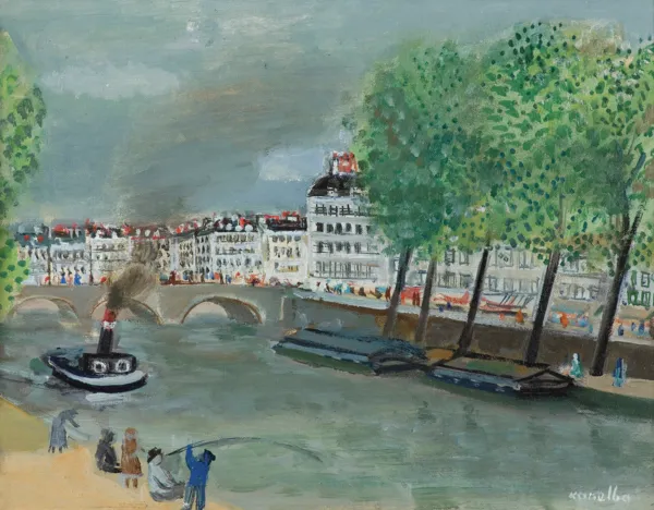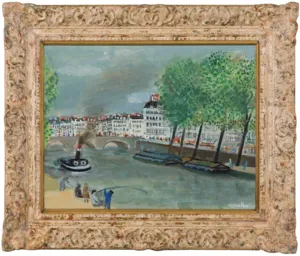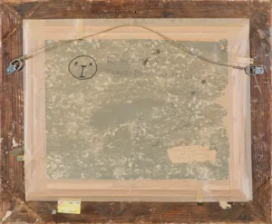Na odwr. (markerem): „I“ [w kółku]; obok (długopisem): R. KANELBA | PARYŻ – BARKI NA SEKWANIE; ponadto (przeciwnie do kompozycji) notatki ramiarskie z rysunkiem przekroju ramy.