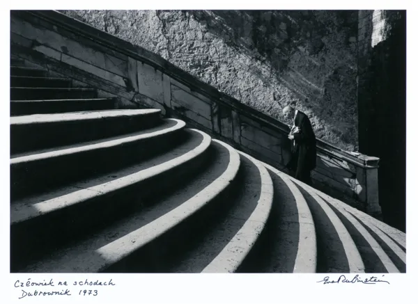 Zdjęcie schodów w Dubrowniku zostało wykonane przez autorkę w 1973 roku podczas jednego z kilku dni, gdy przebywała tam służbowo. Otóż w 1970 roku przyjęła zlecenie z firmy „American Express” na wykonanie w różnych krajach świata serii zdjęć do ich „Annual Reports”; zdjęcia miały być dla zarządu banku (biura firmy etc.) i zdjęcia bardziej turystyc...