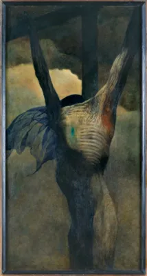 Motyw ukrzyżowania pojawiał się na przestrzeni lat systematycznie w twórczości Beksińskiego, głównie w okresie tzw. fantastycznym (1968-1983). Prezentowany obraz, wczesny i jeszcze nie tak fakturowo idealny jak późniejsze, charakteryzuje boczna perspektywa. Na ciemnym, ledwo widocznym w górnej partii kompozycji, krzyżu ukazane zostaje wychudzone ciało w stanie rozkładu. Szarogranatow...
