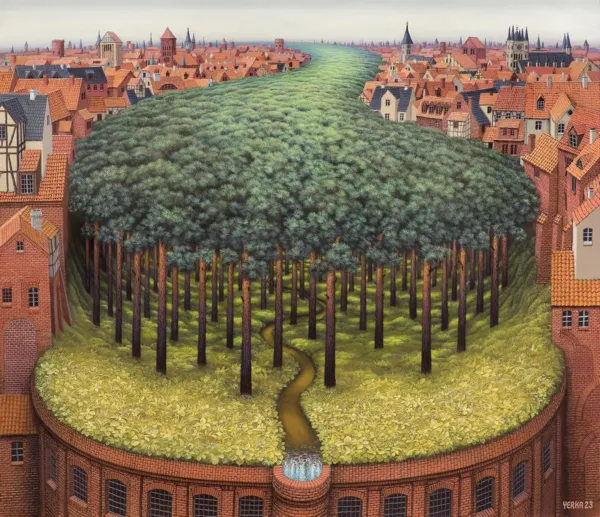 Nazwałem tak miejsce, do którego tęsknię. Jest tuż za zakrętem, za rogiem, za najbliższym wzgórzem. Oaza ciszy i spokoju, dolina w lesie albo parku, ograniczona kolejowym nasypem, kamienicami lub naturalną wyniosłością terenu. Jest tam cicho, nie wieje wiatr, nie płynie czas. Pradoliną na obrazie można nieskończenie długo wędrować i nigdy nie czuć się zmęczonym.