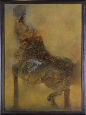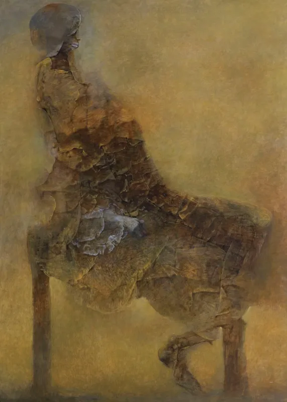 W oferowanym obrazie znana z wcześniejszych kompozycji misterna plątanina ścięgien i kości siedzących na krzesłach kreatur ustąpiła miejsca syntetycznej sylwetce o czytelnej architektonice. Jej forma jest kształtowana za pomocą zniuansowanych przejść kolorystycznych w obrębie ciepłej, monochromatycznej gamy i subtelnych akcentów chłodnej bieli. Dodatek białej barwy to decydujący środek wyrazu – wybielenia pokrywają miejscowo korowatą, organiczną strukturę bryły, gasząc dominujące brązy i nadając jej niezwykłej lekkości w partii głowy i ramion. Beksiński, eksperymentując w ten sposób z efektem trójwymiarowości, postawił odbiorcę przed złudzeniem materializowania się mary w mglistej przestrzeni. Towarzyszący przedstawieniu niepokój jest jednak daleki tego, który paraliżował widzów po konfrontacji z „teatrzykami grozy“ z lat 70. Równoważy go podziw nad rzemieślniczym kunsztem malarza-perfekcjonisty, który w końcowej fazie twórczości wyzwolił się od wizerunku obsesjonata śmierci „obdzierającego ludzi ze skóry“ i powrócił do swych początkowych fascynacji – rzeźby i abstrakcji.