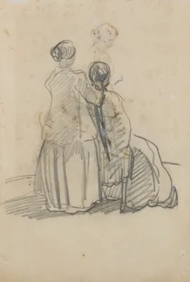 na odwrocie szkic ołówkiem – dwie kobiety w czarnych sukniach