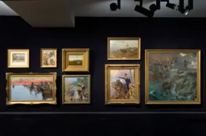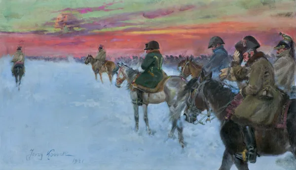 Z roku 1913 pochodzi jeden z najsławniejszych i bardziej popularnych obrazów [pierwszy z serii] Jerzego Kossaka: Widzenie Napoleona w odwrocie spod Moskwy, z głową Sfinksa na tle chmur, przypominającego egipskie zwycięstwo „boga wojny“, który teraz ze sztabem i na tle niekończącej się colonne mourante swych wojsk ciągnie na zachód wśród zamieci, złamany zimą i mrozem. (...) Była to ulubiona kompozycja Jerzego.