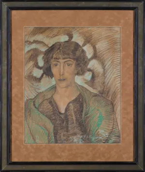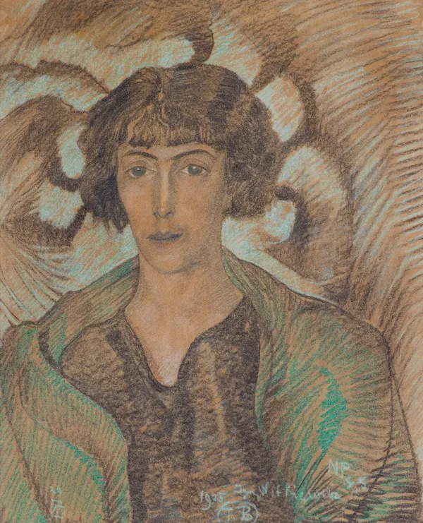 Portret kobiecy wykonany 29 listopada 1925 roku powstał zaledwie kilka miesięcy po ukonstytuowaniu się Firmy Portretowej i został zakwalifikowany do typu B, który w Regulaminie został określony jako „charakterystyczny, jednak bez cienia karykatury [...] z pewnym podcięciem cech charakterystycznych, co nie wyklucza ‘ładności’ w portretach kobiecych. Stosunek do modela obiektywny.“ Wizerunki te przedstawiały wierne podobizny modeli, bez deformacji, głowa była narysowana na ogół bardzo starannie, podobieństwo znakomicie uchwycone, reszta popiersia ujęta była bardziej szkicowo, jednak z zaznaczeniem najważniejszych szczegółów i zachowaniem rzeczywistej kolorystyki ubioru. Typ B był na ogół podpisywany „Ign Witkiewicz” – skrótem drugiego imienia oraz pełnym nazwiskiem jako oficjalne dzieło Firmy Portretowej, pseudonimu „Witkacy” artysta używał portretując bliskich znajomych i przyjaciół.