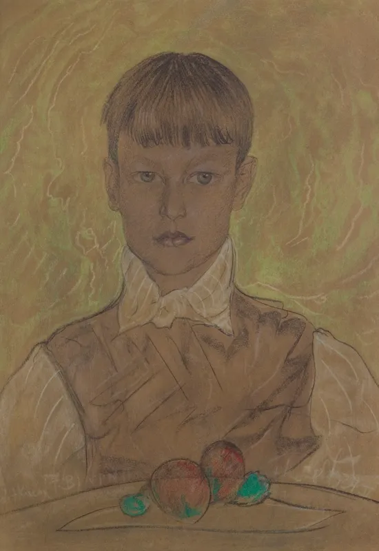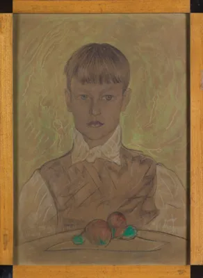 Taki był właśnie z pewnością chłopiec sportretowany w lutym 1937 roku. Spokojnie patrzy wprost na widza nieruchomym wzrokiem niebieskich oczu. Jest gładko uczesany, ma starannie przystrzyżoną w połowie czoła grzywkę, ubrany w koszulę w pionowe białe paski z kołnierzykiem wyłożonym na beżowy bezrękawnik – prawdopodobnie w ukośną kratę zaznaczoną szkicowo, by nie odrywać uwagi od poważnej twarzy małego dżentelmena. Chłopiec siedzi za stołem, na którym znajduje się szkicowo potraktowany podłużny półmisek z rdzawymi i jaskrawo zielonymi kulkami – owocami. Rekwizyt ten jest charakterystyczny dla dziecięcych wizerunków wykonywanych przez Witkacego. Artysta często obiecywał portretowanym dzieciom, że zawartość półmiska otrzymają w nagrodę za grzeczne pozowanie.