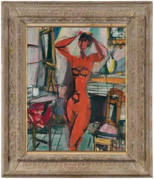 Na ramie nalepka nowojorskiej galerii (druk, długopis): KRASNER GALLERY | 1061 MADISON AVE. RE 4-6110 | TITLE MODEL IN STUDIO | ARTIST ZIGMUNT MENKES | MEDIUM OIL RO-
