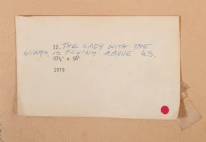 na odwr. l.g. nalepka galerii Aberbach Fine Art z Nowego Jorku z danymi pracy [tytuł: Untitled], niżej (w poł. wysokości) nalepka mpis i dłg.: 12. THE LADY WITH THE | WINGS IS FLYING ABOVE US | [dalej mpis:] 871” x 58” | 1979, w p.g. rogu dłg. pionowo: S. tylna