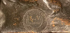 Na podst. gwarancja brązu – okrągły stempel L.V. DEPOSE z napisem w otoku: BRONZE GARANTI AU TITRE PARIS; obok nieczytelny znak w rombie oraz wybity numer: 12; na podst. napis: MOUSSE SIFFLEUR V. SZCZEBLEWSKI