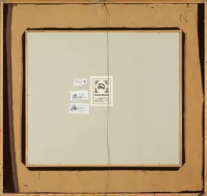 – nalepka autorska wypełniona odręcznie z danymi obrazu i sygnaturą;