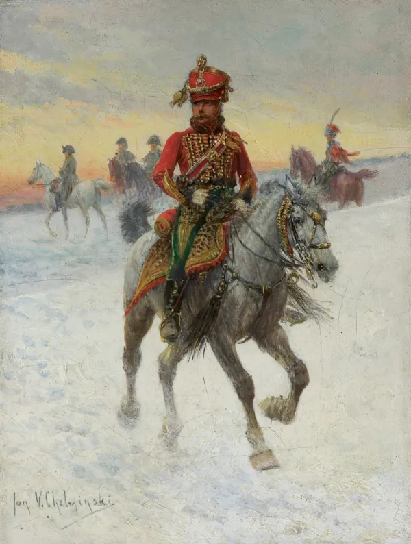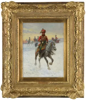 Zbliżona, kameralna kompozycja, prezentująca huzara w śnieżnym pejzażu na siwym koniu, spoglądającego przez lunetę, była sprzedana na aukcji Agry w 2019 (12 października, poz. kat. 20).