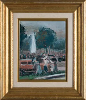Na odwr. nalepka (tusz): Champs Élysées - oil | by | KANELBA | 106 Chatsworth [Court] | Pembroke Rd. | Lon[don W]8 | price 30 Gns. [cena skreślona]; niżej (tuszem): Rond Point de [sic!] Champs Elysé[es] | by | Kanelba | painted in Paris in 1932; niżej częściowo zdarta nalepka z nr. (czerwonym długopisem): 6[0] [w kółku] | SIXTY; obok (czarnym markerem): 60 [w kółku]; przy d. krawędzi, przeciwnie do kompozycji, nalepka londyńskiej pracowni ramiarskiej James Bourlet & Sons Ltd.