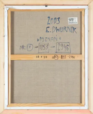 na odwr. na płótnie p.g.: 2003 | E. DWURNIK | >> POZNAŃ<< | NR: IX [w kółku] - 1153 - 2946 [w ramkach], napis na poprzecznej listwie krosna: IX [w kółku] - 1153 - 2946, p.g. nalepka Galerii mil' Art z Poznania