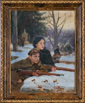Obrona Lwowa, podjęta w latach 1918-1919 wobec braku regularnych oddziałów Wojska Polskiego przez jego młodocianych mieszkańców, była niezmiernie żywa w pamięci Polaków w okresie międzywojennym. Stąd też naturalnie Wojciech Kossak poświęcił Orlętom swój malarski cykl. Na kompozycjach jego autorstwa pojawiają się ujęcia grup chłopców i dziewcząt w czasie walk na cmentarzu Łyczakowskim lub też pojedyncze postaci dzieci z bronią w ręku, wypatrujących wroga. Kilka takich obrazów znajduje się, m.in. w zbiorach Muzeum Narodowego i Muzeum Wojska Polskiego w Warszawie. Na rynku antykwarycznym pojawiają się one rzadko.