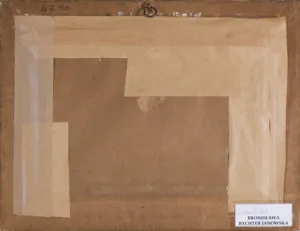 Na odwrocie niebieską (kredka): 1190; na górnej listwie ramy (atrament): 8/8 39 DB; na dolnej po prawej nalepka warszawskiej galerii.