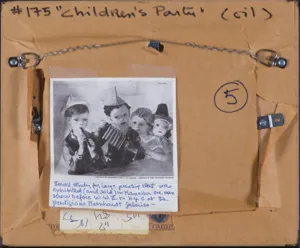 Na odwrocie, centralnie, owalna pieczęć producenta ram – londyńskiej firmy Charles Henry West, powyżej przekreślony numer (czarnym markerem): 176; poniżej (czarnym flamastrem): 175; na górnej listwie krosna (czarnym flamastrem): 1937; ponadto na papierze zabezpieczającym, wzdłuż górnej krawędzi (czarnym flamastrem): #175 “Children’s Party“ (oil); poniżej numer (czarnym flamastrem): 5 [w kółku]; poniżej reprodukcja dużego obrazu olejnego, do którego prezentowane płó...