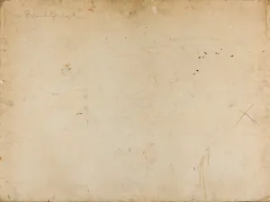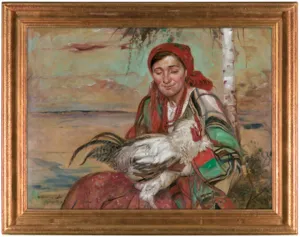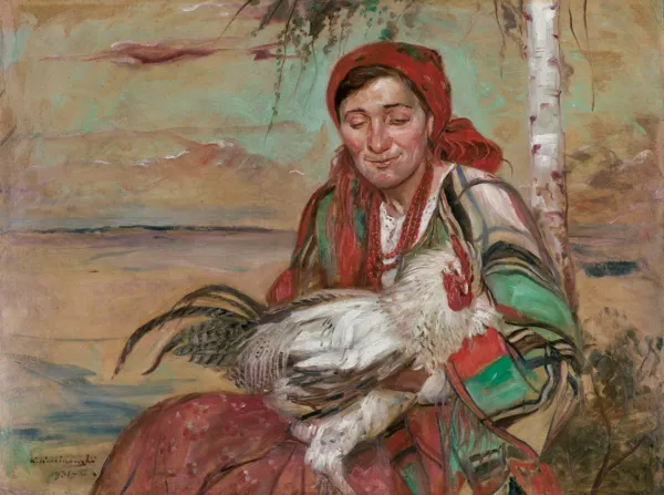 Na odwrocie l..g. (ołówek): Baba z białym kogutem, po lewej dwukrotnie monogram wiązany: MK; l.d. (kredka): a; centralnie (przeciwnie do kompozycji) owalny stempel krakowskiego zakładu Róży Aleksandrowicz: MAGAZYN PRZYBORÓW MALARSKICH | R. ALEKSANDROWICZ | [KRAKÓW,] ul. BASZTOWA 12
