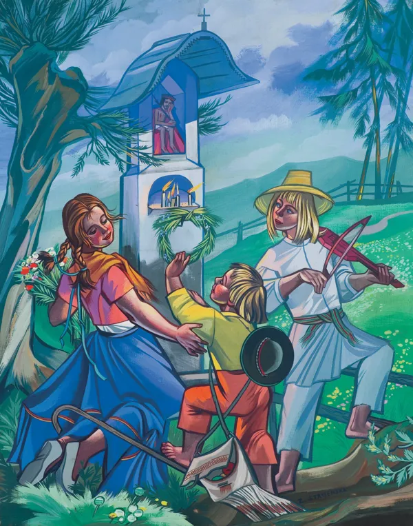 Uproszczona pisownia nazwiska sugeruje, że obraz powstał po wyjeździe artystki z Polski w 1945 r. Stryjeńska zamieszkała wówczas w Genewie, gdzie tworzyła głównie na zamówienie Polaków mieszkających we Francji i USA. Obraz jest doskonałym przykładem jej malarstwa, w którym znakomicie wykorzystuje skróty perspektywiczne do budowy dynamicznych kompozycji. Stryjeńska w swoim malarstwie pragnęła uciec od otaczającej ją szarej rzeczywistości, dlatego jej dzieła przepełnia żywa i nasycona kolorystyka.