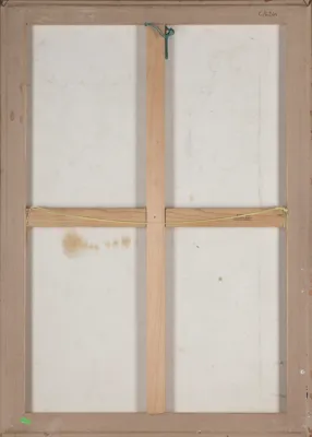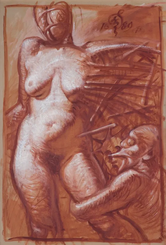 sangwina pędzel, gwasz, pastel, papier żeberkowy jasnooliwkowy naklejony na płótno, 99 x 69 cm (w św. ramy)