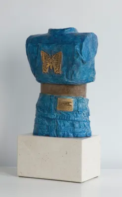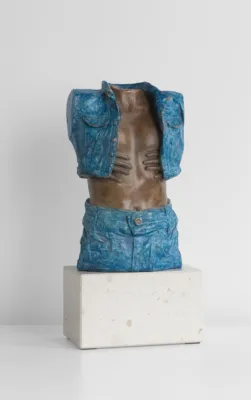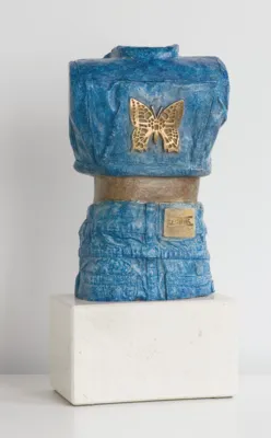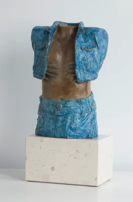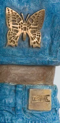 brąz patynowany, złocenie (motyl na plecach kurtki), podstawa: sztuczny kamień