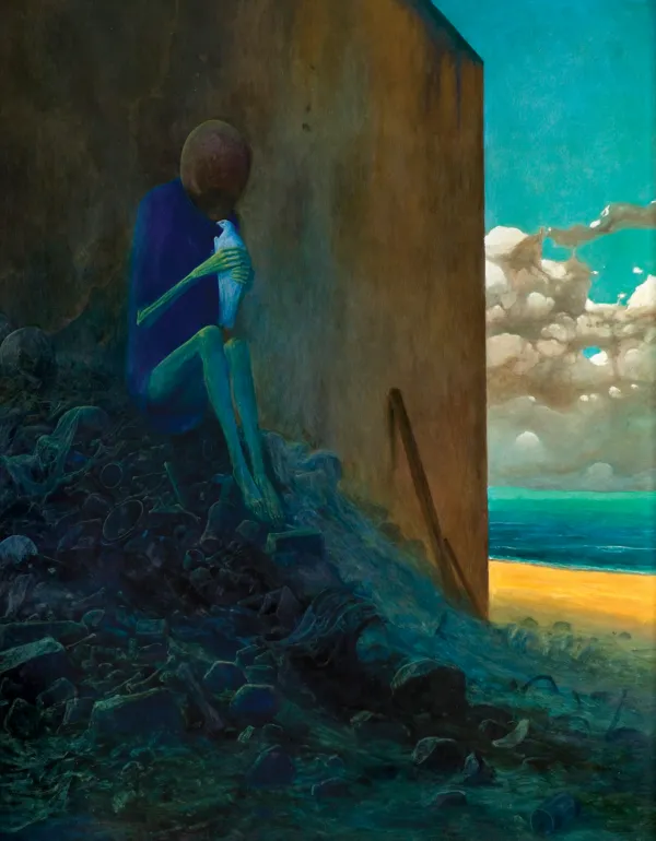 Prezentowany obraz należy do tzw. okresu fantastycznego, który przyniósł Beksińskiemu uznanie i popularność. W dziełach pochodzących z lat 70. artysta często posługuje się motywami o treściach, które można byłoby interpretować według klucza literacko-symbolicznego, odwołującego się do klimatów romantyzmu czy symbolizmu z przełomu wieków XIX i XX, jednak sam Beksiński starał się przekonywać w swoich wypowiedziach, w czasie przeprowadzanych z nim rozmów, że znaczenie jest dla niego bez znaczenia, a zawartych w tych obrazach motywów nie należy poddawać prostej, literackiej interpretacji. Tak też jest w przypadku przedstawionego u nas obrazu, w którym widzimy postać dziecka na zgliszczach, przytulającego białego ptaka w scenerii, gdzie przestrzeń na pierwszym planie – wypełniona zniszczeniem i pustką – sąsiaduje z łagodnym brzegiem morza pod pogodnym niebem.