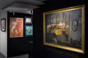 Na odwr. na g. listwie krosna czarną farbą: MARIA ANTO 1974 (ANIOŁY) „KONCERT“ [artystka prawdopodobnie wykorzystała krosno swojego wcześniejszego obrazu], dalej oznaczenia liczbowe i literowe, na l. listwie krosna adres: W-WA, [...], na płótnie i śr. listwie krosna pieczątka prywatnej kolekcji Janusza Jędrkowiaka.