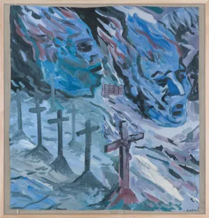 W cyklu obrazów Podróże autostopem, Edward Dwurnik podejmował malarskie próby komentowania tego, czym żyła Polska od końca lat 60. poprzez kolejne dziesięciolecia XX w. Dążąc do przedstawiania zdarzeń, sytuacji czy klimatu towarzyszącego różnym zdarzeniom, starał się oddać nie tylko „publicystyczną“ treść określonych sytuacji, ale przede wszystkim wydobyć malarską ekspresję wybranego motywu. Prezentowany obraz powstał w burzliwych latach 80. XX w., które były czasem robotniczych strajków, powstania „Solidarności“ i brutalnych represji po wprowadzeniu stanu wojennego, a także okresem nasilenia uczuć patriotycznych i religijnych. Dramatyczny czas nasycił obrazy Dwurnika ekspresją i sprawił, że zmieniły się również środki malarskie – kolorystyka stała się przybrudzona, a dukt pędzla bardziej gwałtowny.