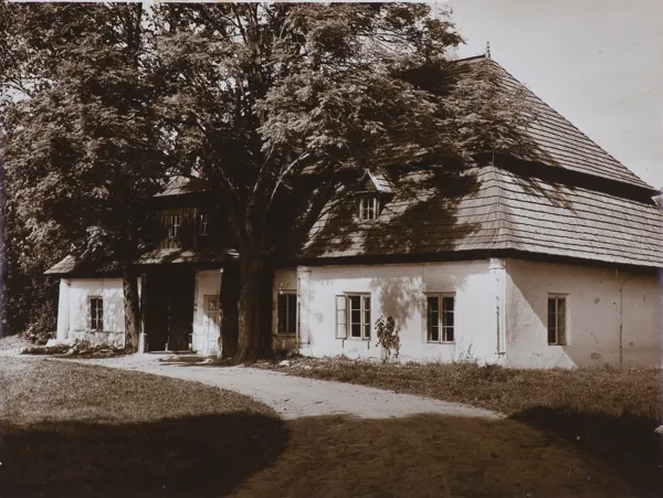 na odwr. oł. w l. części arkusza pionowo opis techniczny wykonania odbitki (ręką autora?), dat. l.g.: 27.I.80, po śr. pieczątka autorska z adresem, l.d.: pieczątka z zastrzeżeniem praw autorskich ZAiKS i datą: 1968, nad pieczątką napis oł.: Złoty Potok: dworek Krasińskich