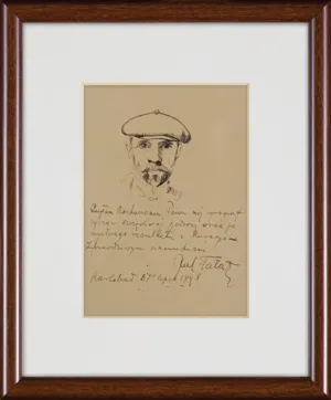 poniżej dedykacja i sygn.: Posyłam Kochanemu Panu mój cyrograf | życząc szczęśliwej podróży oraz po | myślnego rezultatu z kuracyi | Z prawdziwym szacunkiem | Jul Fałat | Karlsbad 6go lipca 1898