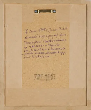 Na odwrocie informacja o pochodzeniu rysunku; poniżej pieczęć zakładu ramiarskiego.