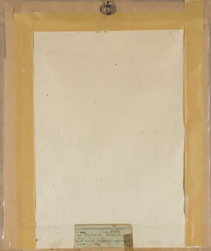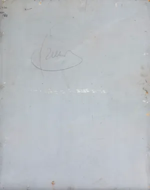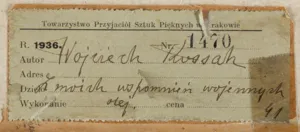 Na odwr. centralnie (ołówek): Ziembicki; l.g. (ołówek): 34 bo | ae | 120. Na d. listwie ramy nalepka (czarny atrament, pieczęć, druk): Towarzystwo Przyjaciół Sztuk Pięknych w Krakowie | R. 1936 | Nr 1470 | Autor Wojciech Kossak | Adres ... | Dzieło Z moich wspomnień wojennych | Wykonanie olej | cena ... | 40.