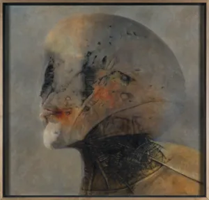 W grudniu 1987 roku, w Galerii Sztuki Alicji i Bożeny Wahl na warszawskim Żoliborzu, odbyła się kolejna w tym miejscu, ciesząca się dużym zainteresowaniem, wystawa Zdzisława Beksińskiego. Znalazło się na niej czternaście powstałych w 1987 dzieł, wśród nich prezentowany obraz. Motyw głowy (obok postaci ludzkiej, katedry, krzyża) wielokrotnie wracał w malarstwie mistrza. Wiązało się to z uniwersalnością tematu, dającą pole do rozlicznych interpretacji i doskonalenia malarskiego warsztatu.