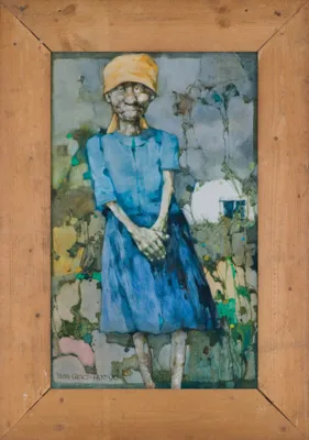 Przedstawiony na naszej aukcji obraz, wyraża ten nostalgiczny klimat poprzez wizerunek staruszki, ukazanej na tle pejzażu jej rodzinnej wsi i zastygłej w pozie oczekiwania na odrodzenie życia i nadziei wraz ze zbliżającą się wiosną.