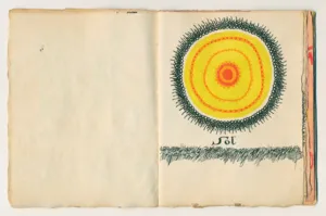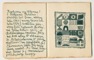 14 kart jednostronnie zarysowanych, zszytych na grzbiecie czerwoną nicią