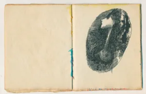 tusz pióro, akwarela, gwasz, papier, bibułka, 12 x 10 cm