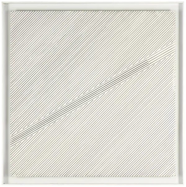 Prezentowany obraz pochodzi z serii obrazów kreskowych, rozpoczętej w 1974 roku, która – jak pisała Bożena Kowalska – wzięła początek, jak mondrianowskie słynne drzewo z natury. Pierwsze prace z tej serii, o skomplikowanych układach kresek szerszych i węższych, przecinających się skośnie, budujących linie napięć – były odbiciem nieładu kazimierzowskich ogrodów zarosłych splątanymi krzewami i chwastem, rozpadających się płotów i bujnych zarośli. Ten powszechnie panujący tu nieład sprowadził artysta już u zarania cyklu rysunkowego do względnego uporządkowania, które stało w połowie drogi pomiędzy niepohamowanym chaosem przyrody a równowagą niemal doskonałego porządku obrazów Stażewskiego. W miarę narastania cyklu, narasta też ład. Kompozycje stają się coraz bardziej uproszczone, rozwichrzone wiązki skośnie rozlatujących się kresek uspokajają się w smugi prostych równoległych wobec siebie: coraz mniej w nich dynamiki i niepokoju, zmniejsza się ich różnorodność i liczba, maleją napięcia kierunkowe. Wszystko do 1976 uspokaja się, porządkuje i ogranicza. (Bożena Kowalska, Henryk Stażewski, Arkady, Warszawa 1985, s. 36-37)