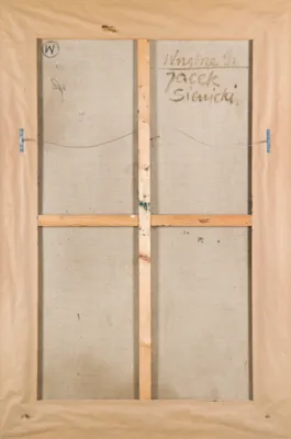 sygn. na odwr. p.g.: Wnętrze 91 | Jacek | Sienicki; l.g.: W [w kółku], poniżej dwie pieczątki: galerii Art Gallery „Vava“ powtórzona na śr. listwie blejtramu, druga – wywozowa