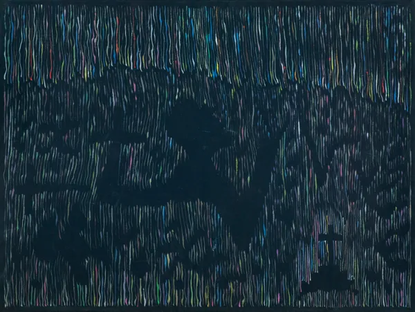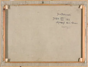 sygn. na odwr. na płótnie p.g.: Jan Dobkowski | „TREN XXV“ 1984 | olej + akryl 60 cm x 80 cm, poniżej ślad pieczątki wywozowej