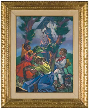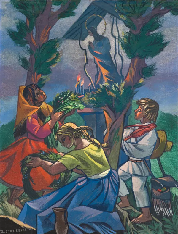 Uproszczona pisownia nazwiska sugeruje, że obraz powstał po wyjeździe artystki z Polski w 1945 r. Stryjeńska zamieszkała wówczas w Genewie, gdzie tworzyła głównie na zamówienie Polaków mieszkających we Francji i USA. Obraz jest doskonałym przykładem jej malarstwa, w którym znakomicie wykorzystuje skróty perspektywiczne do budowy dynamicznych kompozycji. Stryjeńska w swojej twórczości pragnęła uciec od otaczającej ją szarej rzeczywistości, dlatego je...