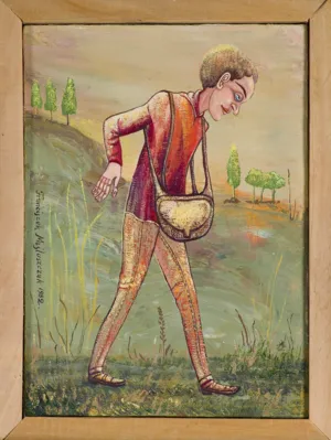 sygn. pionowo wzdłuż l. krawędzi: Franciszek Maśluszczak 1982., na odwr. na płótnie: Franciszek | Maśluszczak | 1982 r | olej | tytuł: GRAM PIEŚŃ | KOLOROWĄ | 33 x 24 cm, niżej l. czerwoną farbą: 282, p. znak (monogram?)