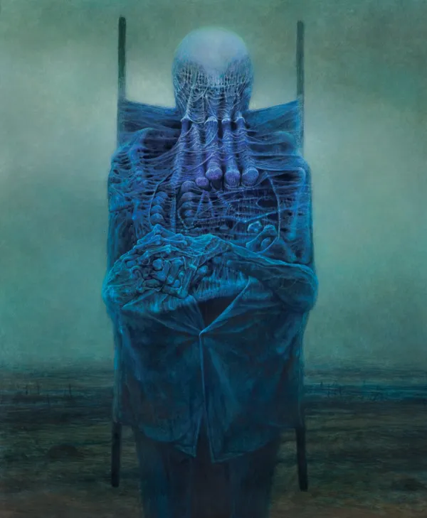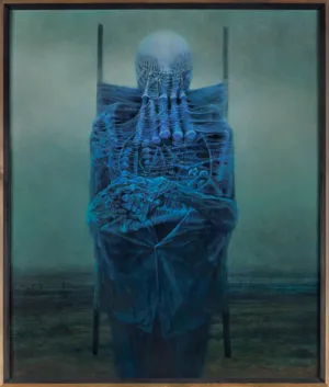 Kompozycja z 1983 roku zdaje się w pełni potwierdzać słowa krytyka. Przytroczone do stelażu ciało kreatury to pseudoanatomiczna plątanina ścięgien i kości ujęta na tle posępnego, apokaliptycznego krajobrazu. Elementy realne mieszają się tutaj z fantastycznymi: zapięte poły płaszcza, warstwa gęstej pajęczyny okrywająca korpus, wielopalczaste dłonie splecione w dramatycznym uścisku, siatka żył. W latach 80. powtarzający się motyw ludzkiej postaci stawał się też coraz częściej punktem wyjścia do rozważania problemów czysto malarskich – pracy nad formą i kolorem. Tym razem efektem warsztatowych zmagań było mistrzowskie opracowanie skali błękitnej dominanty, która imponująco rozpina się od głębokiego granatu po fosforyzujący turkus.