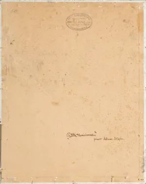Ponadto owalna pieczęć składu przyborów malarskich: TOILES & COULEURS FINES | MAISON E. MORIN | MORIN & JANET, SUC | 5 - Rue Lepic - 5. PARIS | Téléphone MARCADET 07-51; poniżej pieczęć z numerem: 6; l.g., przeciwnie do kompozycji, numer (ołówkiem): 19.
