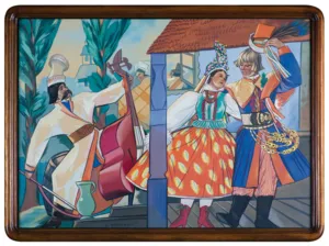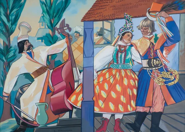 Krakowskie wesele to duża, rozbudowana kompozycja, ukazująca scenę z życia podkrakowskiej wsi. Stryjeńska, niczym reżyser i scenograf na teatralnej scenie, snuje opowieść o staropolskiej tradycji. Architektura drewnianego ganku wytycza kadry i buduje poszczególne plany. Rzeźbiona kolumna, niejako bordiura, oddziela młodą parę, pozwalając im na krótką chwilę intymności. Grajek stojący na progu, choć mógłby stanowić odrębną kompozycję, szerokim gestem wzywa mł...