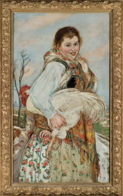 Krakowianka z kurą, to znakomity przykład wirtuozerii artysty z jego najlepszego okresu twórczości. Obraz pełen barwnych akcentów, tworzących radosną harmonię kolorów. Postać młodej, roześmianej wieśniaczki, odchodzącej z dużym białym kogutem pod pachą w zimowym krajobrazie, jest malowana z wielką śmiałością i zręcznością. Całość jest świetlista, żywa i wesoła, ukazując osobisty styl Hofmana.