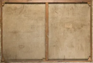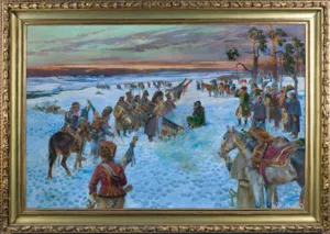 Na odwrocie nalepka (druk, tusz): WYSTAWA OBRAZÓW: „TRZY GENERACJE KOSSAKÓW“ | Nr. 125 | Rok 193 | Autor Jerzy Kossak | Tytuł dzieła Powrót z Moskwy | Rodzaj olej | Cena