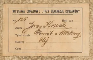 Nalepka na odwrocie obrazu odnosi się do cyklu wystaw, o których opisał Kazimierz Olszański – znawca twórczości Kossaków: Od r. 1931 w wielu miastach, również i powiatowych, poczęto urządzać wystawy „Trzech Generacji Kossaków“. Organizowane były przez różne regionalne stowarzyszenia społeczne, np. przez oddziały Polskiego Czerwonego Krzyża, na rzecz których przekazywano dochód z tych wystaw. Nie ulega wątpliwości, że za tymi inicjatywami stali sami Kossakowie, Wojciech i Jerzy, w większym jeszcze stopniu ten drugi, którym przyświecał cel głównie propagatorski ich malarstwa w sytuacji ogromnego w tych latach naporu i rozgłośnego reklamowania wszelkich kierunków moderny w sztuce. Pierwsza wystawa Trzech Kossaków, bo tak je wtenczas nazywano, została zorganizowana w r. 1931 w Katowicach, przeniesiona wkrótce do Sosnowca. Dochód z niej przeznaczony był na budowę kościoła garnizonowego i szkolnego w Katowicach. Katowicka „Polonia“ o wystawie pisała: „Posiada ona znaczenie specjalnie wielkie, bo prace Kossaków nie tylko przez swe walory artystyczne, ale i przez treść swoją, swój sentyment i wdzięk budzą i potęgują uczucia polskie, spełniając prócz misji kulturalnej, także misje patriotyczne... Jerzy Kossak, malarz urodzony, naturalny sukcesor dziada i ojca, (...) Jerzy po ojcu odziedziczył również jego brawurę w pracy i sypie obrazami jak z rękawa. Na samej wystawie w Katowicach wystawił 70 prac, przeważnie dużych i wielkich“. (...) Następna wystawa trzech Kossaków została pokazana w r. 1932 w Łodzi, z przeznaczeniem dochodu na PCK. „Całość wystawy przedstawia się bardzo dodatnie i imponująco pisała łódzka prasa. Młodzież szkolna powinna jak najszerzej zaznajomić się z wystawą, gdyż arcydzieła tam zgromadzone ilustrują historię dziejów narodu polskiego“. Na ekspozycji łódzkiej było 79 prac Jerzego (...). Po Łodzi wystawa trzech Kossaków pojechała do Tarnowa (...) a w r. 1932 aż do Stanisławowa, gdzie dochód z niej przeznaczono na pomoc dzieciom bezrobotnych, jak donosił wydrukowany Katalog, i pokazała 87 prac Jerzego. W roku 1933 wystawę trzech Kossaków pokazano we Lwowie, gdzie Jerzy wystawił jeszcze więcej, bo 92 swoje obrazy (...). Jeszcze w tym samym roku wystawa trzech Kossaków zdołała objechać Łowicz, Leszno, Kalisz, Piotrków, Lublin, Przemyśl. (K. Olszański, Jerzy Kossak, Wrocław-Warszawa-Kraków 1992, s. 32-33)
