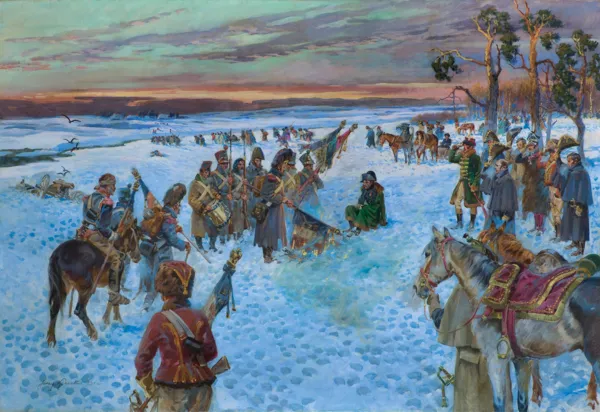 Ta rozbudowana scena przedstawia palenie sztandarów utraconych w bitwie pod Berezyną pułków. Zwycięstwo nad Berezyną jest uważane za jeden z największych sukcesów militarnych Napoleona. Wycofująca się spod Moskwy Wielka Armia znalazła się w potrzasku i tylko dzięki mistrzowskim posunięciom cesarza udało jej się przetrwać, a nawet zadać poważny cios Rosjanom. Po zakończonej bitwie, która umożliwiła Francuzom spokojny odwrót, oficerowie wraz z Napoleonem złożyli hołd poległym, paląc sztandary ich pułków. Motyw ten jest jednym z rzadziej pojawiających się u Jerzego Kossaka tematów z wojen napoleońskich.