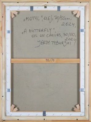 sygn. na odwr.: "MOTYL", OLEJ, 70/50 cm, | "A BUTTERFLY" | OIL ON CANVAS, 70/50, | 2024 | JERZY TYBURSKI
