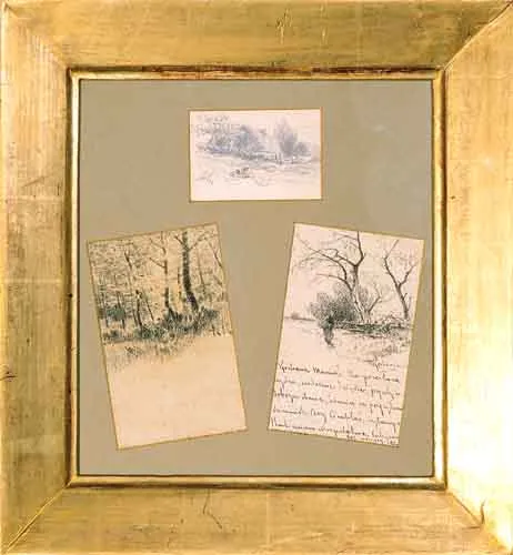 Rysunki oprawione we wspólne passe-partout.